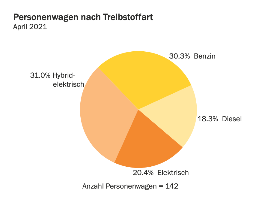 43 Personenwagen (30.3%) waren Benziner, 26 Personenwagen (18.3%) waren Dieselfahrzeuge, 44 waren hybrid- elektrisch und 29 rein elektrisch angetriebene Personenwagen mit Anteilen von 31.0% bzw. 20.4% aller im Berichtsmonat erstzugelassenen Personenwagen.