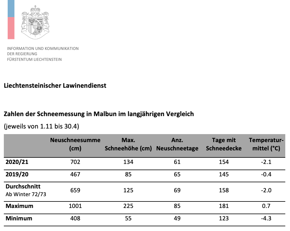 Der Liechtensteinische Lawinendienst blickt auf einen schneereichen Winter mit einem neuen Rekordwert zurück. Die Saison war seit acht Jahren eine der kältesten und verzeichnete grosse Neuschneemengen.
