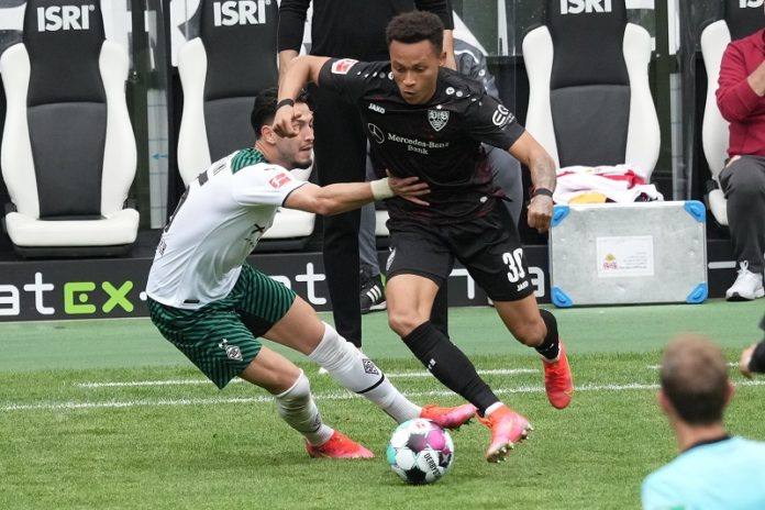 15.05.2021, Borussia Park, Moenchengladbach, GER, 1.FBL. Borussia Mönchengladbach vs VfB Stuttgart, im Bild: Roberto Massimo (Stuttgart #30),im Zweikampf gegen Ramy Bensebaini (Gladbach #25), Foto: Picture Alliance, Frankfurt/Main.