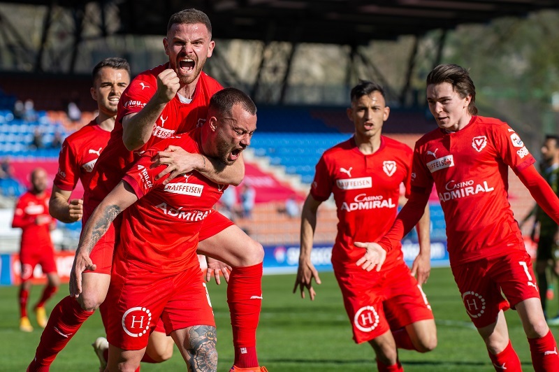 Archivbild zeigt den Jubel beim FC Vaduz nach dem 3:0-Sieg am 11. April 2021 gegen den FC Sion. Bild: Jubelnder Simani mit Torschütze Lüchinger (vorne). Foto: Jürgen Posch. Gegen Wil will das Frick-Team am morgigen Sonntag ebenfalls einen Sieg landen.