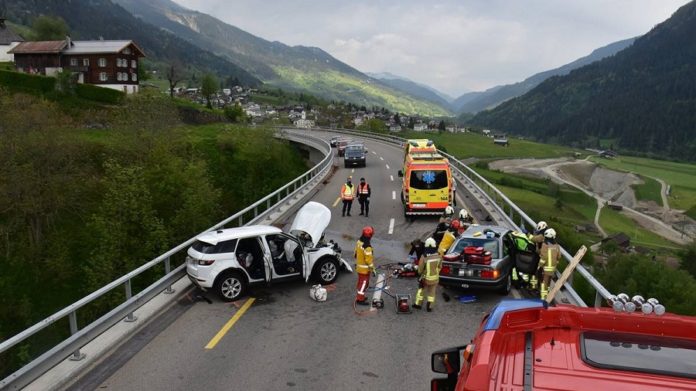 In Rabius in der Nähe von Disentis ereignete sich am Samstagnachmittag ein tödlicher Verkehrsunfall. Bei einer Frontalkollision starb ein 52-jähriger Mann, seine 52-jährige Beifahrerin wurde schwer verletzt. Die drei Insassen des entgegenkommenden Autos mussten leicht verletzt ins Spital. Foto: Kapo Graubünden