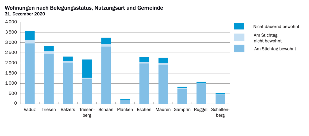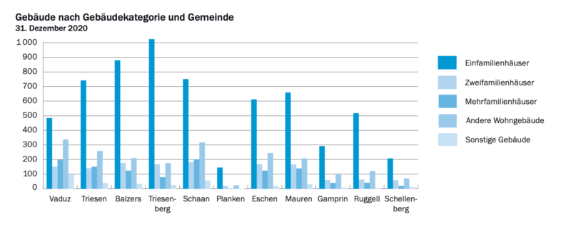Gemäss den Ergebnissen des Amtes für Statistik wurden Ende 2020 in Liechtenstein 11’203 Gebäude mit Wohnnutzung gezählt. Im Vergleich zum Vorjahr entspricht dies einer Zunahme von 0.7% bzw. 73 Gebäuden. Von diesen Gebäuden dienten 8’797 Gebäude ausschliesslich der Wohnnutzung, 2’073 Gebäude wurden vorwiegend zu Wohnzwecken genutzt und 333 Gebäude mit Wohnungen sahen hauptsächlich eine andere Nutzung vor.