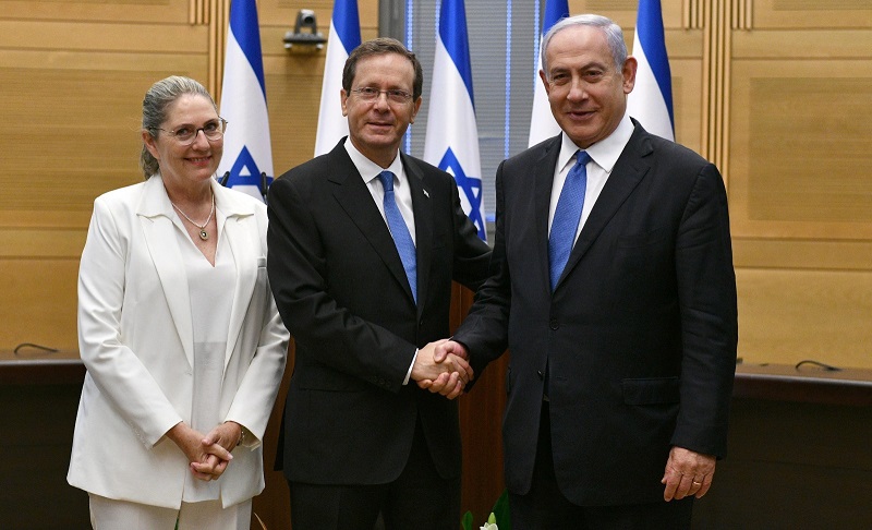 Benjamin Netanjahu (r-l), Ministerpräsident von Israel, und Izchak Herzog, neu gewählter Präsident von Israel, und seine Frau Michal stehen bei einer Sondersitzung des Knesset. Inmitten einer politischen Umbruchsituation hat Israels Parlament den früheren Oppositionsführer Herzog zum Staatspräsidenten gewählt. Foto: Picture Alliance, Frankfurt/Main, aufgenommen am 2.Juni 2021 vor der Knesset.