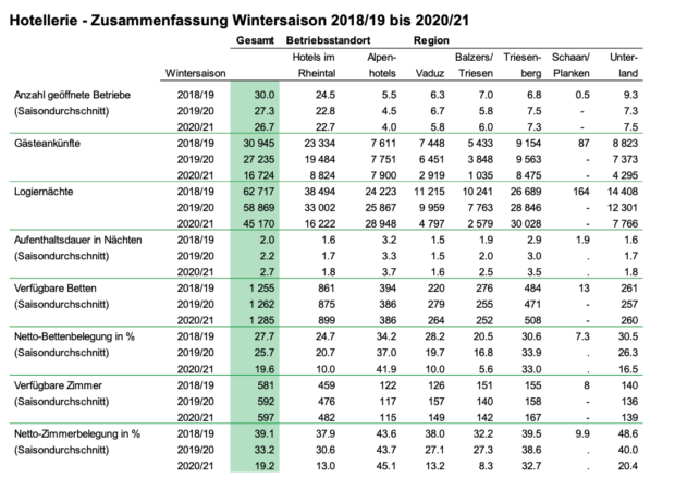 In der Wintersaison 2020/21 (Monate November 2020 bis April 2021) nahmen gemäss den Ergebnissen des Amtes für Statistik die Logiernächte in der Hotellerie im Vergleich zum Vorjahr ab. In der Wintersaison 2020/21 verbrachten die Gäste 45’170 Logiernächte in den Hotels in Liechtenstein. Dies sind 23.3% bzw. 13’699 Logiernächte weniger als im Vorjahreszeit- raum. In den Monaten März und April lagen die Logiernächte über dem Vorjahresniveau. In den Monaten November, Dezember, Januar und Februar wurde das Vorjahresniveau nicht erreicht. Die Ursache für den starken Rückgang der Logiernächte von November 2020 bis Februar 2021 waren die Auswirkungen der COVID-19 Pandemie.