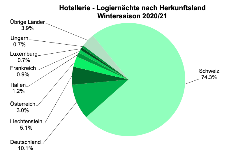 In der Wintersaison 2020/21 erreichten die Gäste mit dem Herkunftsland (Wohnsitzstaat) Schweiz einen Anteil von 74.3% an den gesamten Logiernächten in der Hotellerie. Im Vorjahr waren es 43.4% gewesen. Die Gäste aus der Schweiz verbrachten 33’539 Nächte in Liechtenstein. Dies sind 7’990 Nächte bzw. 31.3% mehr als im Vorjahr. Die Gäste aus Deutschland buchten 4’567 Logiernächte und kamen damit auf einen Logiernächteanteil von 10.1%. Danach folgten die Gäste aus Liechtenstein mit einem Logiernächteanteil von 5.1%. Im Vergleich zum Vorjahr hat sich die Zahl der Logiernächte von Gästen aus Liechtenstein mehr als verdoppelt. Die Gäste aus Österreich machten einen Logiernächteanteil von 3.0% aus.