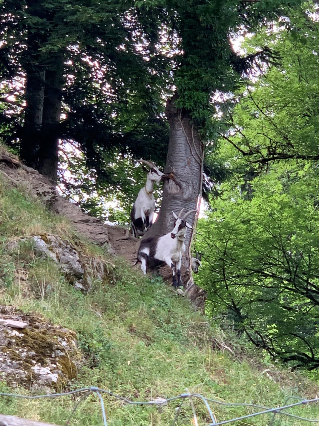 Auch unsere Hausziegen geniessen die angenehmen Temperaturen und suchen bei Bedarf den Schatten der Bäume. Sie sind sehr neugierig. Diese Aufnahme entstand am Sonntag in der Nähe der Burgruine Schellenberg. Bild: Wilmar