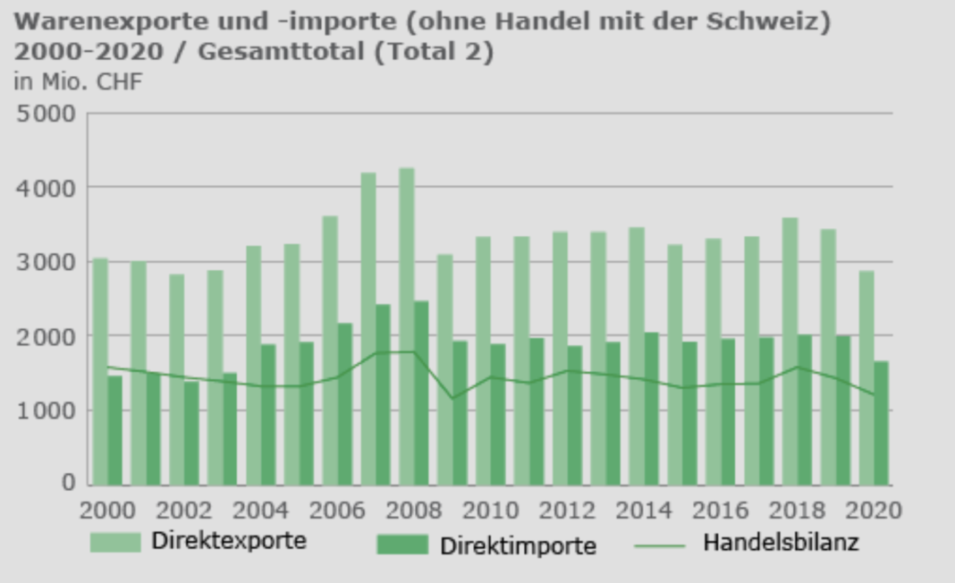 Die Exporte sanken gegenüber dem Vorjahr um 16.4% (CHF -561 Mio.). Die Importe lagen 2020 bei CHF 1651 Mio. Sie gingen gegenüber dem Vorjahr um 17.0% (CHF -339 Mio.) zurück.