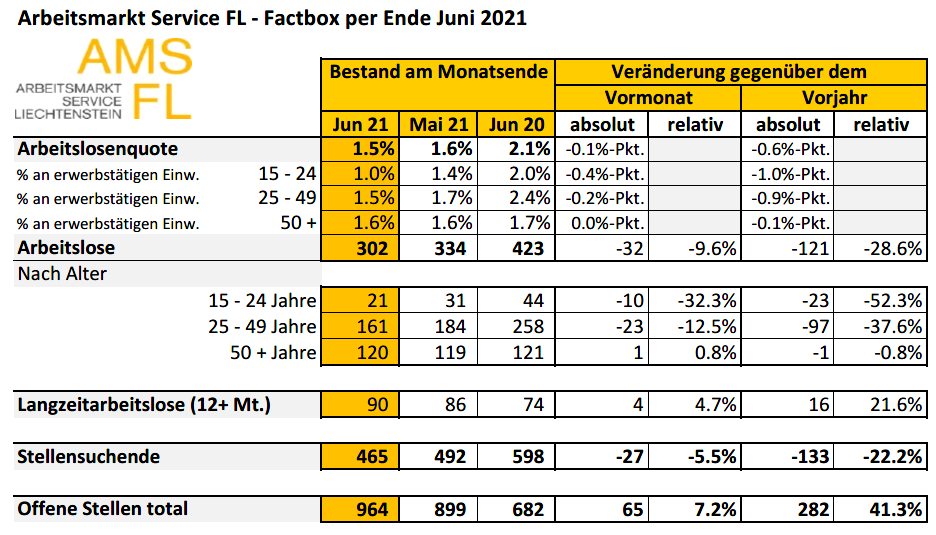 Beim Arbeitsmarkt Service Liechtenstein (AMS FL) waren Ende Juni 302 Arbeitslose gemeldet, 32 Personen weniger als im Vormonat. Die Arbeitslosenquote verringerte sich damit von 1,6 Prozent im Mai 2021 auf 1,5 Prozent im Berichtsmonat. Gegenüber dem Vorjahresmonat verringerte sich die Arbeitslosigkeit um 121 Personen. Die Arbeitslosenquote sank gegenüber dem Vorjahresmonat um 0,6 Prozentpunkte.