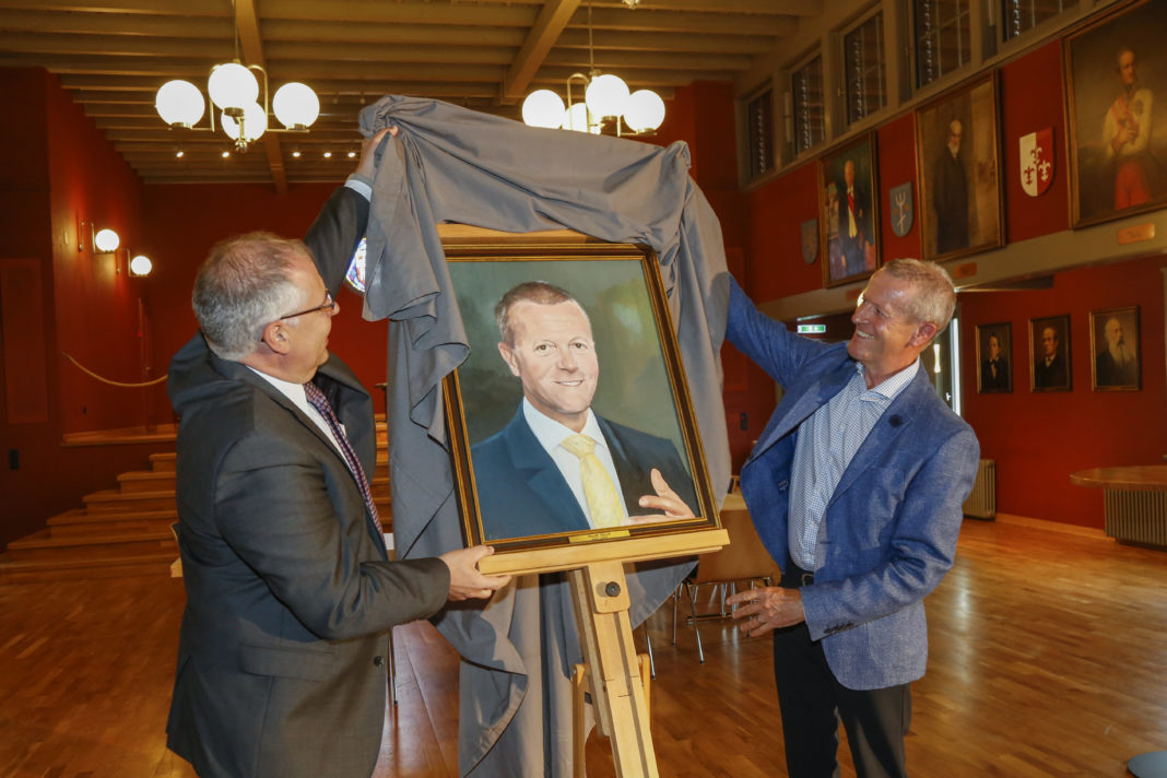 Es ist Tradition, dass der Bürgermeister von Vaduz nach Beendigung seiner Amtszeit von einer Künstlerin oder einem Künstler gemalt und das Porträt entlang der Seitengänge des Vaduzer Rathaussaals aufgehängt wird. Heute Nachmittag enthüllte Bürgermeister Manfred Bischof das Porträt von Ewald Ospelt in einem kleinen aber feierlichen Rahmen. Er bedankte sich bei seinem Vorgänger für die zwölf Jahre als Bürgermeister und lobte seine Arbeit.
