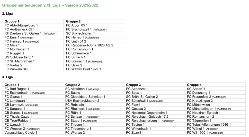 Wie der Ostschweizer Fussballverband (OFV) bekanntgibt, sind für die neue Saison 2021/22 folgende Gruppen der 2. und 3. Liga im Verbandsgebiet des OFV eingeteilt worden.