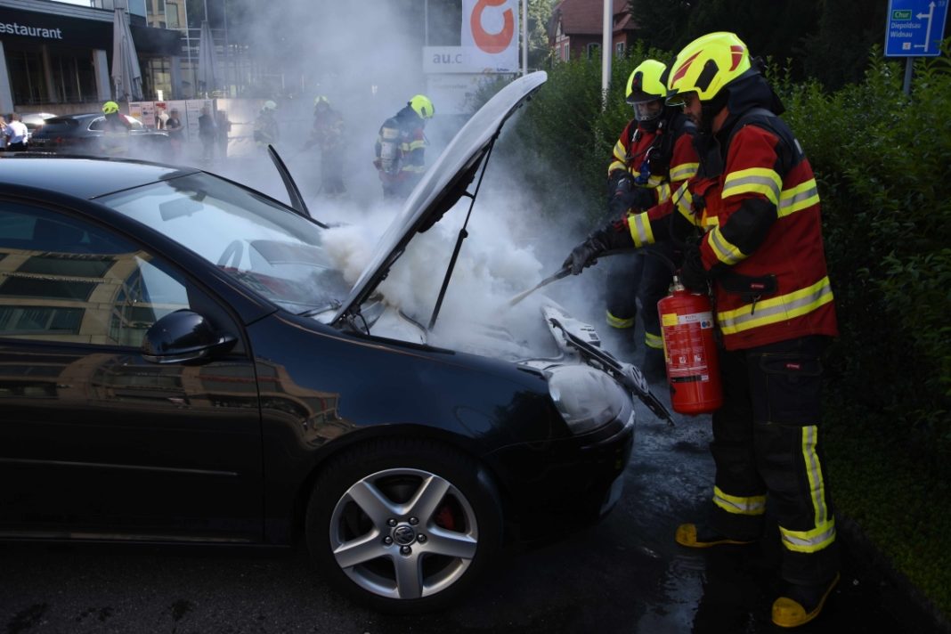 Eine 21-jährige Autofahrerin stellte beim Startversuch ihres Autos einen beissenden Geruch fest und verliess das Auto. Kurz darauf entwickelte sich Rauch aus dem Motorenraum und sie alarmierte die Feuerwehr. Diese kühlte mit Wasser die Hitze im Motorenraum und stoppte so die Rauchentwicklung. Ursache dürfte ein technischer Defekt sein. Am Auto entstand Totalschaden.