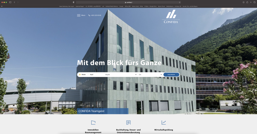 Die drei Unternehmungen unter einem Dach werden noch kompakter präsentiert. Insbesondere die Geschäftseinheiten Immobilien, Baumanagement und Generalunternehmung der CONFIDA Immobilien AG, welche sich mit der Konzeption, der Realisierung und der Betreuung von Architektur und Immobilienprojekten befassen, präsentieren ihre Geschäftseinheiten noch strukturierter. Interessante Entwicklungsprojekte und Referenzen oder ein digitales Kundenlogin zum digitalen Aus-tausch sind nur einige Neuerungen. Seit 1964 tätig, gehört die CONFIDA Gruppe heute zu den führenden Unternehmen für Bau- und Immobili-endienstleistungen, Steuer- und Unternehmensberatung, Buchhaltung und Wirtschaftsprüfung in Liechtenstein und Umgebung.