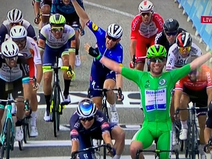 Mark Cavendish feiert seinen 3. Etappensieg bei der diesjährigen Tour und bleibt im Grünen Trikot des Punktebesten.