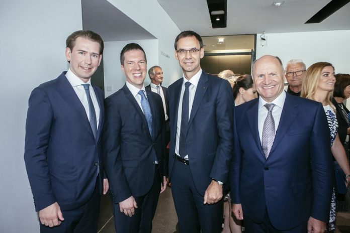 Treffen der Polit-Prominenz an den Bregenzer Festspielen. Von links der österreichische Bundeskanzler Sebastian Kurz, Regierungsrat Manuel Frick, Landeshauptmann Markus Wallner und den Präsidenten der Bregenzer Festspiele Hans-Peter Metzler (v.l.). .Bild: Lisa Mathis.
