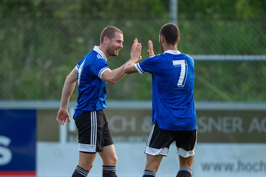 FC Triesen-Torjäger Julien Hasler und Toplu freuen sich nach einem Treffer. Foto: Jürgen Posch