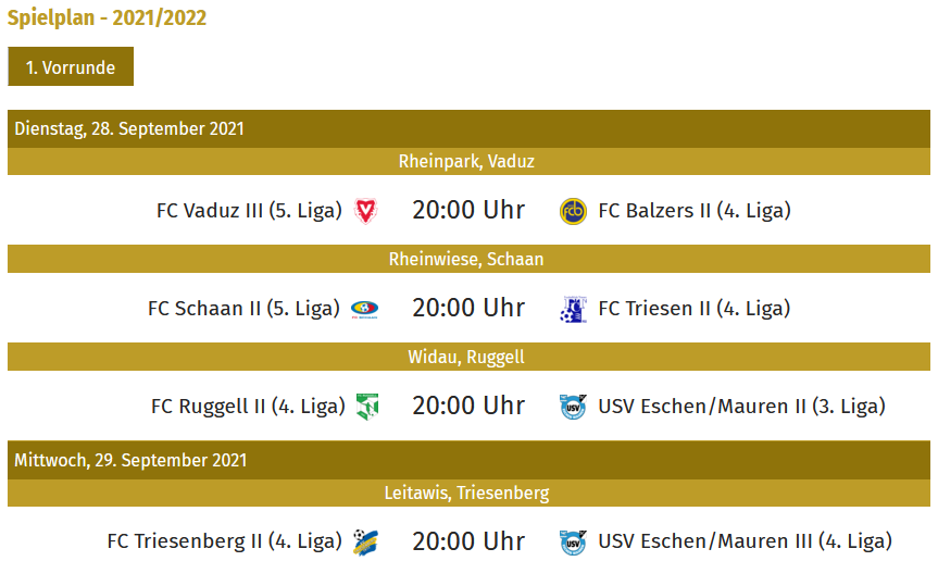 Die vier Sieger steigen in die nächste Runde auf und treffen dort auf die vier Teams FC Triesen I, FC Triesenberg I, FC Schaan I und FC Vaduz II. In der dritten Runde greifen danach die vier höchstklassierten Mannschaften des Landes in den Wettbewerb ein. Es sind dies FC Vaduz I, FC Balzers I, USV Eschen/Mauren I und FC Ruggell I.