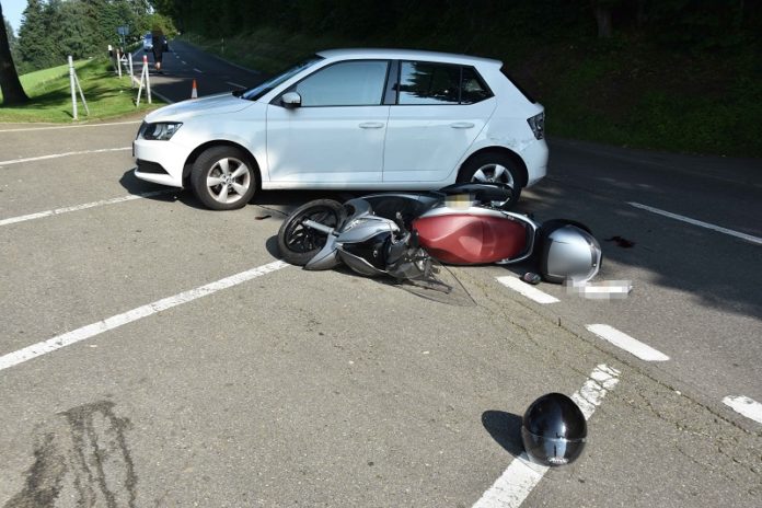 Rorschacherberg – Am Freitag (20.08.2021), um 17:20 Uhr, ist es auf der Heidenerstrasse zu einer Kollision zwischen einem Roller und einem Auto gekommen. Eine 23-jährige Motorradfahrerin wurde dadurch leicht verletzt und musste von der Rettung ins Spital gebracht werden. Es entstand Sachschaden in der Höhe von mehreren tausend Franken.