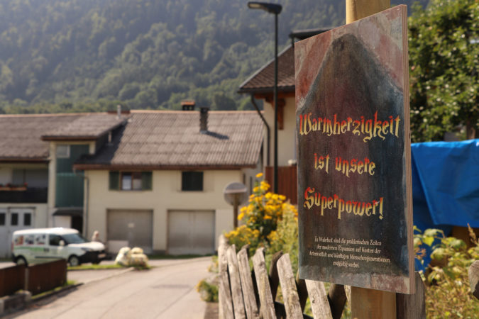 Die unter dem Titel „Odyssaia“ installierten Texte und Bilder wurden bewusst mit Empathie und einem moralischen Unterton realisiert. So wandelt man auf dem Weg einer Kuhprinzessin, eines gescheiterten Dichters, eines nicht ganz schwindelfreien Menschen und wir trifft auf Odyssaia, einen kleinen Wieselgeist, der einst in dieser Gegend hauste. Mäkipää und Thomas betonen, dass es ihnen nicht darum gehe, den Besucher der Installation im öffentlichen Raum in einen ästhetischen Rausch zu versetzen, sondern darum, den gewohnten Gedankenfluss für einen Moment zu unterbrechen und die Begeher auf die Botschaften der Wegweiser aufmerksam zu machen und sie zur Reflexion zu verführen. Als Eingriff und künstlerische Erweiterung ist„Odyssaia“ einerseits eine Homage an die Landschaft, andererseits steht sie in Konkurrenz zu dieser, wenn es darum geht, die Aufmerksamkeit auf sich zu lenken. Die Künstlerinnen sind sich dabei bewusst, dass ihre Werke auf dem Weg zur Glalätscha ein ähnliches Schicksal erleiden werden wie oftmals alte Postkarten oder Internet-Memes auf sozialen Plattformen. Grundsätzlich aber sei es eine Frage, ob wir wach und offen genug seien, um zu einem Dialog beizutragen. Die Themen Heimat und Umweltschutz sind ihrer Meinung eng miteinander verflochten. Und gelebt würden unsere Ideen im eigenen Dorf, in der Region und im Land – eben weil globales Denken immer nur auf lokaler Ebene umgesetzt werden kann, so Mäkipää und Thomas.