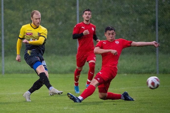 Der FC Vaduz empfängt morgen Aufsteiger KF Dardania aus St. Gallen. Aufnahme v. 3. August 2021, FC Vaduz II gegen Erstligist USV. Im Bild Ganz rechts Oberer FCV II. Links USV-Stürmer Simone Kühne. (Foto: Michael Zanghellini)