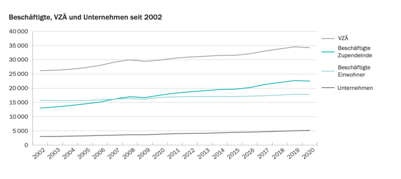 Am 31. Dezember 2020 standen den 40 328 Beschäftigten 42 758 Voll- und Teilzeitarbeitsplätze zur Verfügung, was gegenüber 2019 einer Reduktion von 0.5% respektive 224 Arbeitsplätzen entspricht. Die Personen aus Liechtenstein belegten mit 19 795 Voll- und Teilzeitarbeitsplätzen einen Anteil von 46.3%.