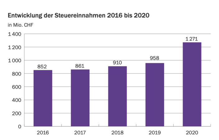 Die gesamten Steuereinnahmen des Landes und der Gemeinden erreichten im Rechnungsjahr 2020 einen Gesamtbetrag von CHF 1271 Mio. Sie lagen damit 32.7% bzw. CHF 313 Mio. über dem Wert des Vorjahres. Zum Anstieg der Steuereinnahmen im Jahr 2020 trug insbesondere ein einmaliger ausserordentlicher Steueranfall der Ertragssteuer bei.