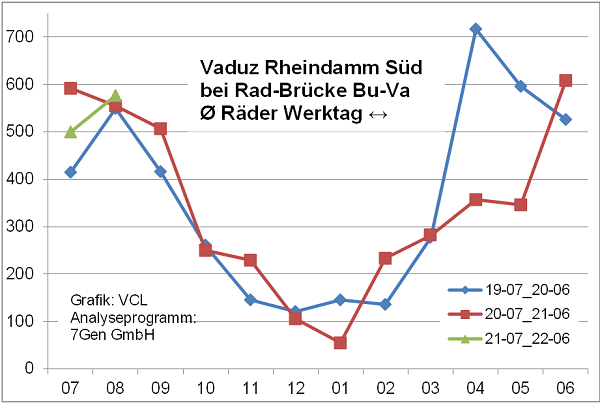 Auf dem Rheindamm zwischen Lettstrasse und Lochgass befindet sich keine Zählstelle. Deshalb liess die Gemeinde Verkehrszählungen durchführen, z.B. vom 1. bis 7. Juli 2019. Das sind keine alten, sondern relevante Zahlen. Pro Werktag fahren bis zu 300 Einspurige in beide Richtungen. Die für den Radverkehr auf dem Vaduzer-Rheindamm relevante Zählstelle befindet sich auf dem Rheindamm bei der Radbrücke Buchs-Vaduz, Richtung Süd, also in Richtung Vaduz. Im gleichen Zeitraum Juli 2019 wurden dort bis zu gut 500 Velos pro Werktag gezählt. Die Grafik sehen sie auf www.vcl.li > Medienmitteilungen, Vaduzer-Märchen Nr. 2