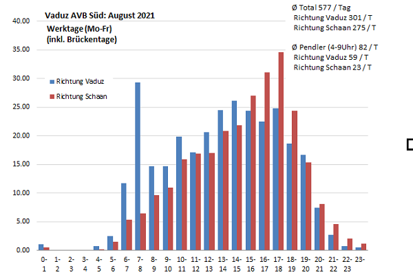 Lorenz Benz schreibt von “falschen Interpretationen des VCL und unlesbarer Grafiken”. Um diese Aussage zu prüfen mögen die StimmbürgerInnen bitte unter www.vcl.li den aktuellen Eintrag “Vaduz: Rheindamm und Radverkehr” anschauen mit einer Grafik zum Tagesgang der gezählten Velos im August 2021. Als Datei sind dargestellt: die Monatszahlen seit der Eröffnung für den durchschnittlichen Werktagsverkehr, den durchschnittlichen Wochenendverkehr sowie die zwischen 4:00 und 08:59 an Werktagen durchschnittlich gezählten Räder. Daraus kann abgeschätzt werden, dass es sich bei etwa einem Drittel bis zur Hälfte der an Werktagen gezählten Radfahrenden um Arbeitswege handelt.