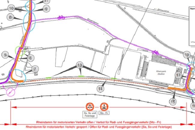 Der Fussverkehr kann auf den naturbelassenen Wuhrweg ausweichen; er ist kein Radweg. Für den Radverkehr wird der Rheindamm werktags gesperrt. Radfahrende müssen einen Umweg via Binnendamm fahren mit 2-maliger Querung des Autoverkehrs. Alle Alltagsradfahrenden wissen, dass solche Umwege mit Gefahrenstellen sehr unbeliebt sind. Sie sind eine Abschreckung besonders für tägliche Arbeitswege per Fahrrad.