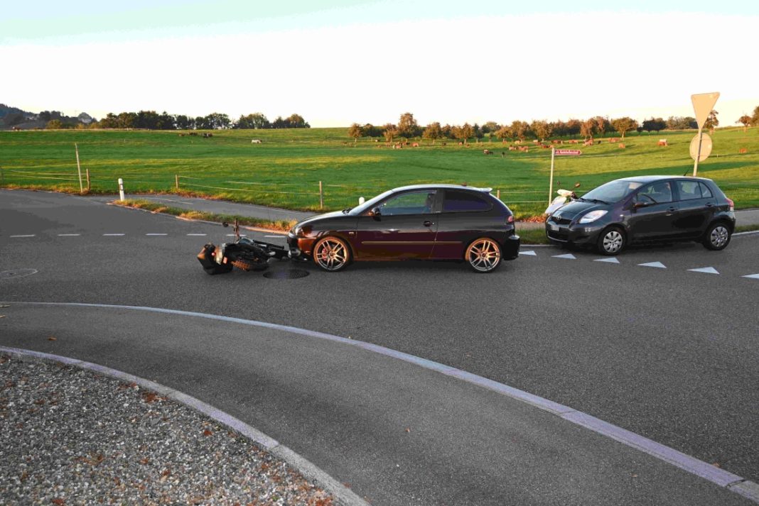 Am Donnerstag (23.09.2021), um 18:45 Uhr, ist auf der Dorfstrasse ein Auto mit einem Motorrad zusammengestossen. Ein 17-jähriger Motorradfahrer wurde dabei verletzt. Der Rettungsdienst brachte ihn ins Spital. Es entstand Sachschaden von mehreren tausend Franken.