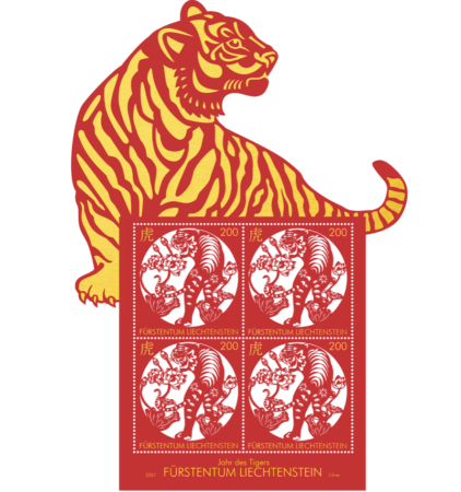 Die zur Tradition gewordene Serie über chinesische Tierkreiszeichen neigt sich mit dem vorletzten Motiv «Jahr des Tigers» (Wertstufe CHF 2.00) langsam dem Ende zu. Das chinesische Horoskop charakterisiert den Tiger als mutig, stark und voller Energie. In seinem Zeichen geborene Menschen zeichnen sich laut Astrologen durch Agilität, Tatkraft, Selbstbewusstsein und Durchsetzungsvermögen aus. Wie schon ihre zehn Vorgänger, wurde auch diese Sondermarke in Form eines filigranen Scherenschnitts gefertigt.