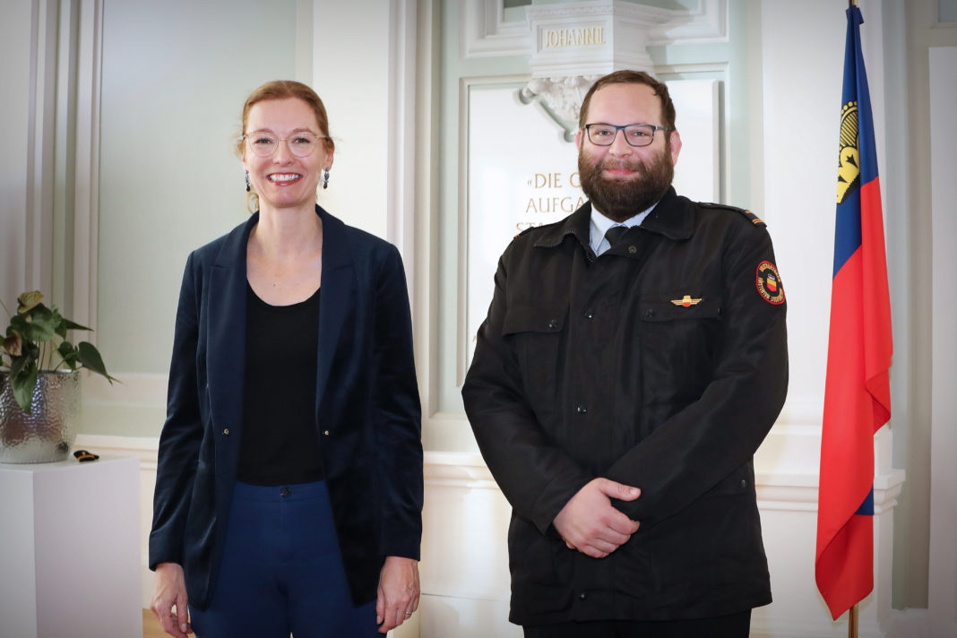 Am Mittwoch, 27. Oktober 2021, durfte Daniel Bargetze aus Triesen, aus den Händen von Innenministerin Sabine Monauni das Feuerwehr-Instruktorenabzeichen entgegennehmen und wurde damit offiziell zum Feuerwehrinstruktor in Liechtenstein ernannt. Die Innenministerin betonte dabei die Wichtigkeit seines Engagements, sich neben seiner Tätigkeit in der Feuerwehr zusätzlich auch noch in der Ausbildung einzusetzen und dankte dem frischgebackenen Instruktor für seine Bereitschaft, diese wertvolle Aufgabe zu übernehmen. Sie blickte auch zurück auf das zweijährige Auswahl- und Ausbildungsverfahren, welches jeder Instruktor bis zur Ernennung durchläuft und dankte allen, welche den Neuinstruktor durch Motivation, Förderung und Unterstützung begleiteten.