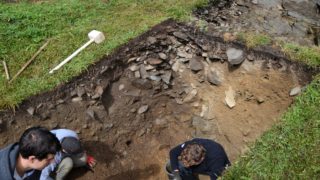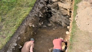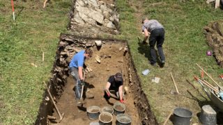 Die neuen Ausgrabungen mit studentischer Beteiligung unter Leitung von Prof. Rüdiger Krause haben im September in der Knappagruaba nun eine kleine Sensation offenbart: Vier Wochen dauerte die Ausgrabung, die in mehreren Grabungsschnitten am steilen Berghang vonstattenging. An den Oberflächen waren Spuren früheren Bergbaus gut erkennbar, sie bestanden aus Abraumhalden aus Taubgestein, den runden in den Fels gehauenen Schächten und aus den Hinweisen auf tiefer gelegene Eisenerzgänge. Erstmals konnten diesen Herbst montanarchäologische Befunde aus römischer Zeit freigelegt werden, die nicht nur für das kleine Montanrevier, sondern weit darüber hinaus für die Ostalpen einmalig sind. Ausgegraben wurden bis in drei Meter unter der Oberfläche zwei verfüllte Bergbauschächte, die im Bereich einer Vererzung abgetieft wurden. Davon zeugen an der Oberfläche des Felsens Klüfte mit Eisenoxyden und Quarzgängen, die den sogenannten Eisernen Hut – also die Oxidationszone eines Erzganges, bilden. Wie tief die Schächte in den Untergrund reichen, das soll zukünftig durch Rammkernbohrungen herausgefunden werden.