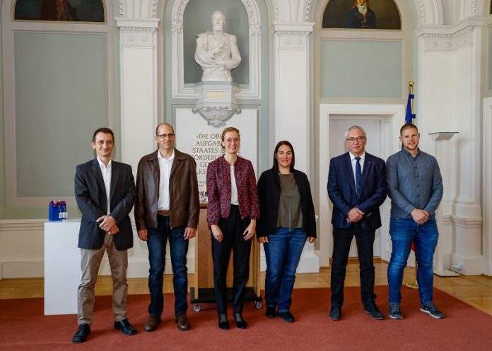 Von links:Andreas Tribelhorn, Thomas Casanova, Regierungschef-Stellvertreterin Sabine Monauni, Stefanie Noser-Wolz, Georges Berger und Fabian Niedermann (Leiter Fischereiaufsicht). Bild: IKR