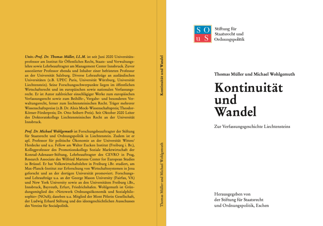 Die neueste Publikation der Stiftung für Staatsrecht und Ordnungspolitik, welche von Univ.- Prof. Dr. Thomas Müller, LL.M. und Prof. Dr. Michael Wohlgemuth verfasst wurde, widmet sich der Verfassungsgeschichte Liechtensteins unter der Prämisse Kontinuität und Wandel. Die Autoren kommen unter anderem zum Ergebnis, dass es alles andere als selbstverständlich ist, dass ein Land in Europa auf eine hundertjährige Verfassung zurückblicken kann. Darin sehen sie auch einen Vorteil und einen Grund für den Erfolg Liechtensteins in den letzten 100 Jahren. Sie führen aus: «Wie vielleicht kein anderes Land hat Liechtenstein in diesen einhundert Jahren behutsamen und friedlichen Wandel mit erstaunlicher Kontinuität kombiniert. Manche mögen darin einen konservativen, wenn nicht gar reaktionären Charakter der Verfassung Liechtensteins vermuten. Wir sehen dies anders. Wir sehen in der Kombination von Konservatismus und pragmatischem, liberalem Wandel eher einen Vorteil und Garanten für Stabilität und Vertrauen im Fürstentum.»