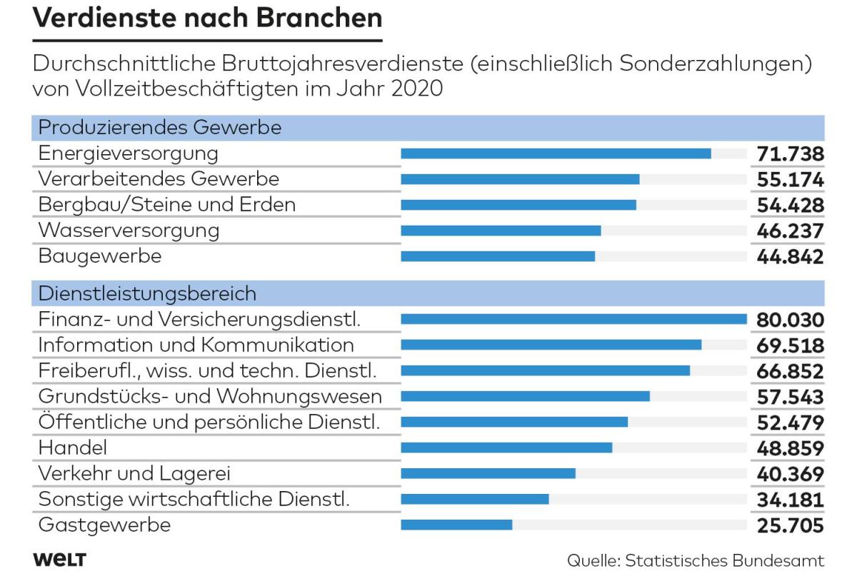Auch die Branche hat einen Einfluss auf die Höhe des Gehalts. Dem Statistischen Bundesamt zufolge verdienten vollzeitbeschäftigte Arbeitnehmer im Bereich Finanz- und Versicherungsdienstleistungen im vergangenen Jahr mit einem Bruttojahresverdienst von 80.030 Euro ohne Sonderzahlungen am besten. Danach folgte der Bereich Energieversorgung mit 71.738 Euro. Am wenigsten war im Gastgewerbe mit 25.705 Euro drin.