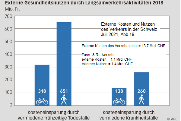 Klima- und Umweltnutzen: Mehr Wege zu Fuss und per Velo statt per Auto führen zu weniger störendem Lärm, weniger krank machenden Emissionen und zu weniger Ausstoss von Klima-schädigenden Treibhausgasen. Der Fussverkehr ist besonders leistungsfähig und dabei äusserst raumeffizient. Auch per Fahrrad benötigt man etwa 10 Mal weniger Strassenfläche als per Auto. Volkswirtschaftlicher Nutzen: Die externen, von der Gesellschaft getragenen Kosten (z.B. Unfall-Folgekosten) für die Schweiz belaufen sich laut Bundesamt für Raumentwicklung für Personenwagen auf 4.8 Mrd. Franken oder 7.8 Rappen pro Kilometer. Für Liechtenstein sind das etwa externe Kosten von 25 Millionen pro Jahr für Personenwagen. Dagegen leistet der Fuss- und Radverkehr in der Schweiz bei Kosten von ca. 1.1 Mrd. Franken und einem Nutzen von ca. 1.4 Mrd. Franken (davon 0.9 vom Fussverkehr) einen positiven Beitrag von 381 Mio. Franken. Der Nutzen von zu Fuss Gehenden und Rad Fahrenden für unsere Gesellschaft beträgt also etwa zwei (2) Millionen Franken pro Jahr. Durch aktive Mobilität wird zudem die Verkehrsinfrastruktur entlastet: weniger Autostau heute und weniger Ausbau der Infrastruktur in Zukunft. Steigen wir um: uns selbst, der Gesellschaft und Klima/Umwelt zuliebe.