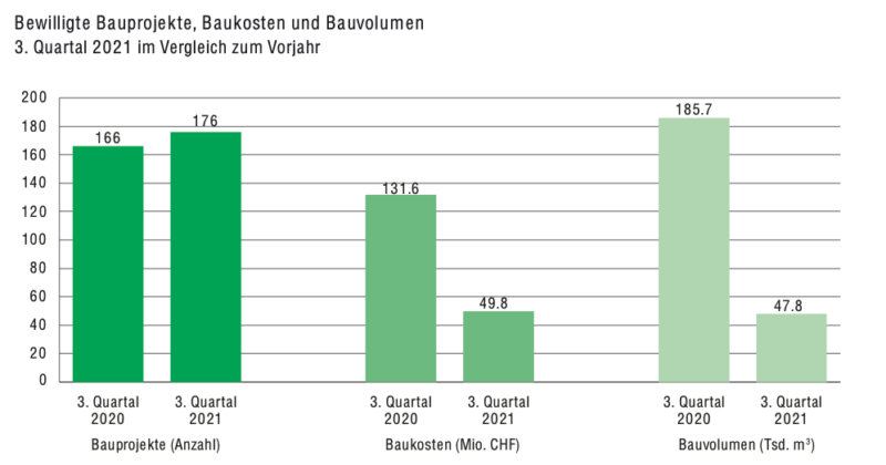Gemäss den Ergebnissen des Amtes für Statistik wurden im 3. Quartal 2021 vom Amt für Bau und Infrastruktur 176 Baubewilligungen erteilt. Im gleichen Quartal des Vorjahres waren es 166 Baubewilligungen gewesen. Die Anzahl bewilligter Neubauprojekte nahm gegenüber dem Vorjahresquartal um drei auf 39 zu. Die Anzahl der Veränderungsbauprojekte stieg gegenüber dem Vorjahresquartal um sieben auf 137. Die Anzahl der erteilten Baubewilligungen erhöhte sich in den Bereichen Wohnen, Industrie und Dienstleistungen sowie Land- und Forstwirtschaft, und sowohl für öffentliche als auch für private Auftraggeber.