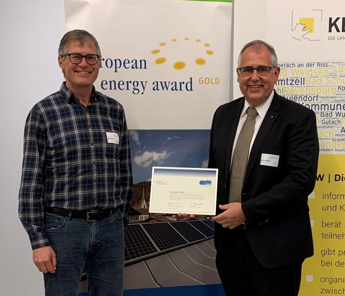 Bildunterschrift (Foto: Gemeinde Vaduz): Bürgermeister Manfred Bischof und Thomas Noser,Mitglied der Energiekommission, nahmen in Ravensburg den „European Energy Award Gold“ für die Gemeinde Vaduz entgegen.