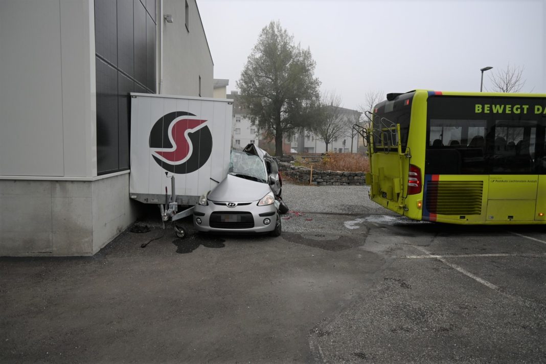 Am Freitag stiess in Triesen gegen 15:30 Uhr ein Linienbus der LIEmobil bei einem Fahrmanöver mit einem parkierten Personenwagen zusammen. Dabei schob er diesen gegen einen dahinter abgestellten Sachentransportanhänger und anschliessend beide Fahrzeuge gegen eine Hausfassade. Am Linienbus entstand Sachschaden, an den beiden anderen Fahrzeugen Totalschaden. Verletzt wurde niemand.