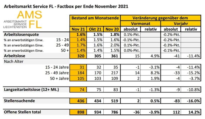 Vaduz (ots) – Beim Arbeitsmarkt Service Liechtenstein (AMS FL) waren Ende November 320 Arbeitslose gemeldet, 15 Personen mehr als im Vormonat. Die Arbeitslosenquote erhöhte sich damit von 1,5 Prozent im Oktober 2021 auf 1,6 Prozent im Berichtsmonat. Gegenüber dem Vorjahresmonat verringerte sich die Arbeitslosigkeit um 41 Personen (-11,4 %). Die Arbeitslosenquote sank gegenüber dem Vorjahresmonat um 11,4 Prozentpunkte.
