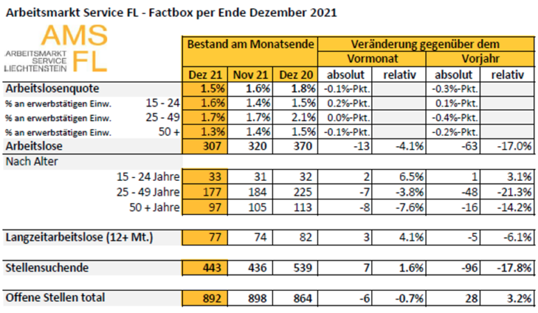 Beim Arbeitsmarkt Service Liechtenstein (AMS FL) waren Ende Dezember 307 Arbeitslose gemeldet, 13 Personen weniger als im Vormonat. Die Arbeitslosenquote verringerte sich damit von 1,6 Prozent im November 2021 auf 1,5 Prozent im Berichtsmonat. Gegenüber dem Vorjahresmonat verringerte sich die Arbeitslosigkeit um 63 Personen (-17 %). Die Arbeitslosenquote sank gegenüber dem Vorjahresmonat um 0,3 Prozentpunkte.