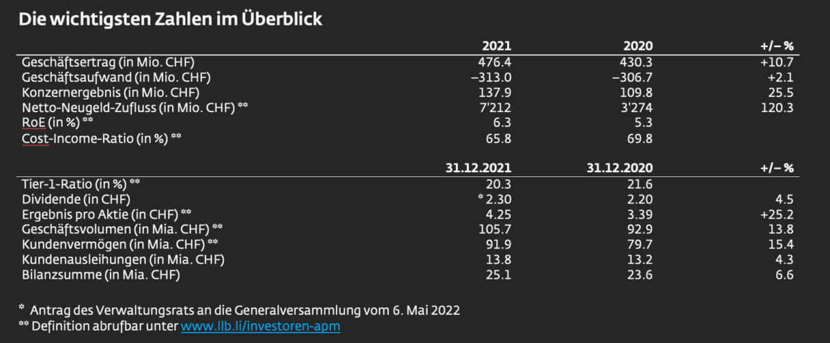 Die LLB-Gruppe blickt auf ein höchst erfolgreiches Geschäftsjahr 2021 zurück. Das Konzernergebnis konnte auf CHF 137.9 Mio. gesteigert werden. Das ist das beste Ergebnis seit über zehn Jahren. Mit einem Netto-Neugeld-Zufluss von CHF 7.2 Mia. verzeichnete die LLB-Gruppe das grösste organische Wachstum ihrer bisherigen Geschichte. Sowohl beim Geschäftsvolumen, den Kundenvermögen als auch bei den Kundenausleihungen konnten neue Höchststände erreicht werden.
