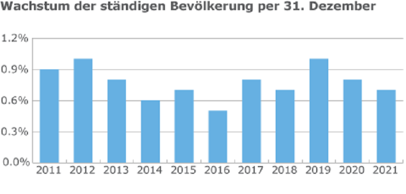 Die ständige Bevölkerung Liechtensteins erhöhte sich, gemäss den vorläufigen Ergebnissen des Amtes für Statistik, im Jahr 2021 um 260 Personen bzw. 0.7% und erreichte am 31. Dezember 2021 den Stand von 39’315 Personen. Somit lag das Bevölkerungswachstum unter demjenigen des Vorjahres mit 0.8% (308 Personen). Das Liechtensteiner Unterland verzeichnete mit 1.8% einen stärkeren Zuwachs als das Oberland.