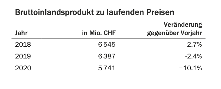 Im Pandemiejahr 2020 schrumpfte das Bruttoinlandspro- dukt um rund CHF 646 Mio. gegenüber dem Vorjahreswert von CHF 6 387 Mio. auf CHF 5 741 Mio.