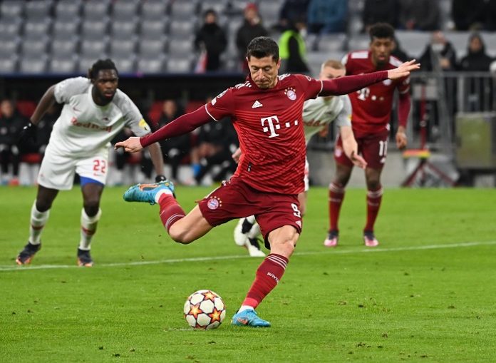 Mann des Abends: Robert Lewandowski mit 3 Treffern. Hier erzielt er per Penalty die 1:0-Führung. Foto: Picture Alliance, Frankfurt/Main