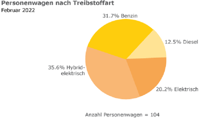 Mit 37 Personenwagen sind mehr als ein Drittel der 104 erst zugelassenen neuen Personenwagen hybridelektrisch betriebene Personenwagen, 33 sind Benziner, 21 reine Elektro-Personenwagen und 13 Dieselfahrzeuge.