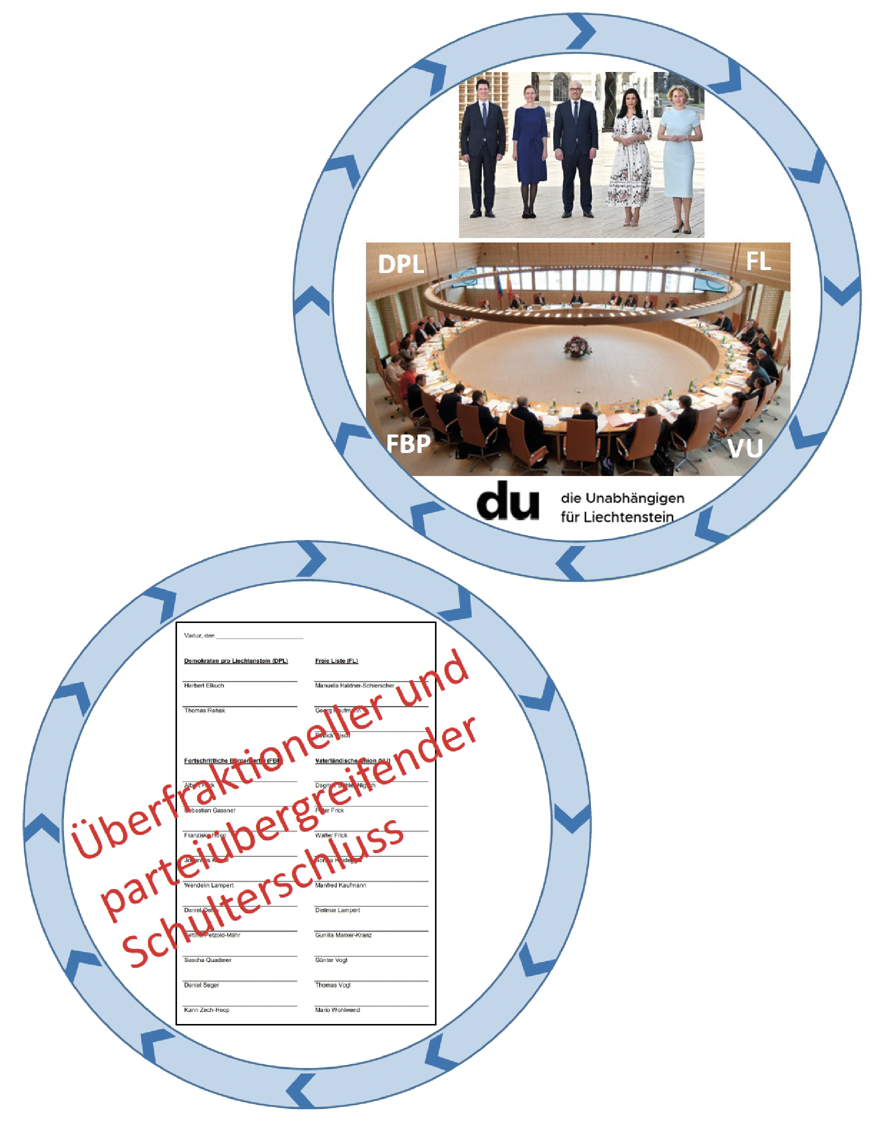 Die Postulanten bzw. das Strategische Begleitgremium, bestehend aus je einer Person jeder Landtagsfraktion und einer Person der Partei DU wie auch aus zwei Mitgliedern der Interessensgemeinschaft Mobiles Liechtenstein als Koordinatoren, werden diesbezüglich in der Kommunikation und Einbindung der Bevölkerung ebenfalls neue Wege gehen. Die Regierung kann sich diese Dynamik und diesen Wandel in der Denkweise als entscheidendes Exekutivorgan gewinnbringend zu eigen machen und so von der Unterstützung sowie dem gemeinsamen Ziehen am gleichen Strick im Sinne der positiven und nachhaltigen Entwicklung des Landes profitieren.