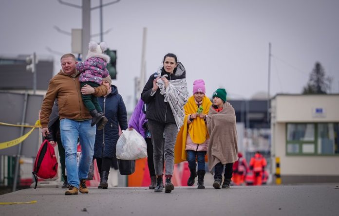 Eine Famile passiert die ukrainisch–polnische Grenze. Zahlreiche Menschen kommen hier auf der Flucht vor dem Krieg in der Ukraine über die Grenze. 2.3.2022. Foto: Picture Alliance, Frankfurt/Main
