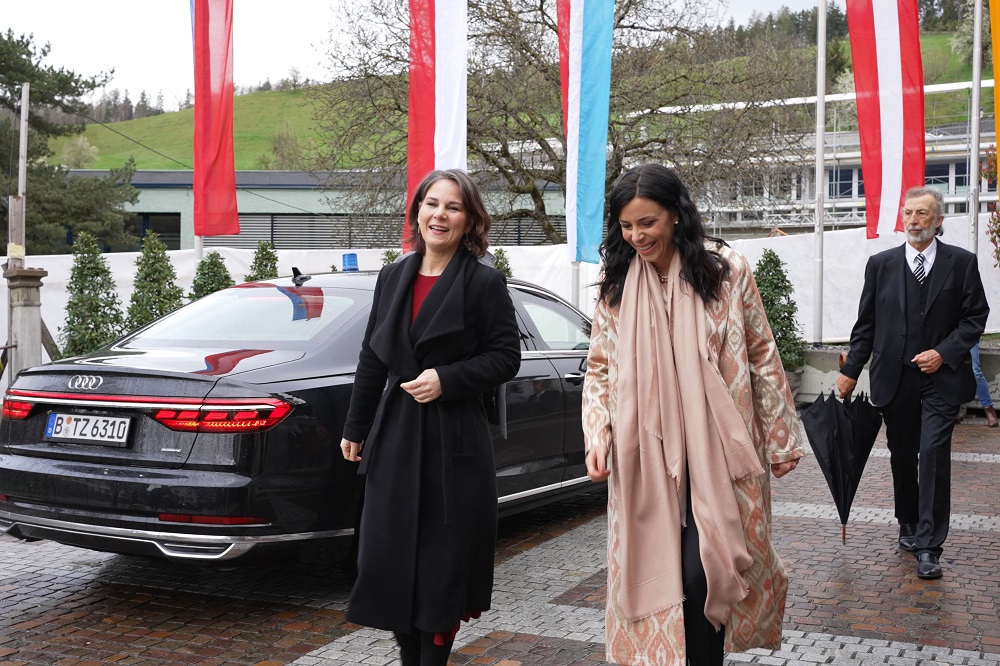 Besuch der deutschen Aussenministerin Annalena Baerbock in Liechtenstein. Bild: Kulturhaus Rössle in Mauren, wo sie von ihrer Amtskollegin Dominique Hasler in Empfang genommen wird. Foto: IKR