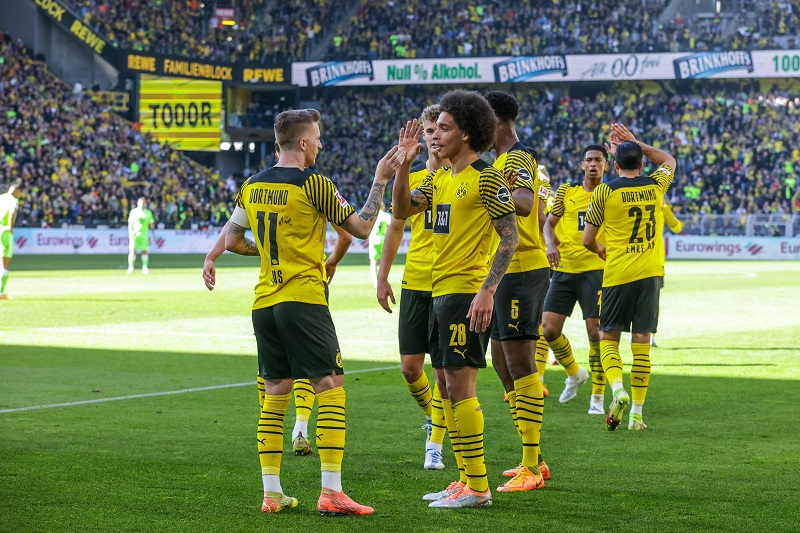 16.04.2022, Fussball, Saison 2021/2022, 1. Bundesliga, 30. Spieltag, Borussia Dortmund - VfL Wolfsburg, Die Spieler von Borussia Dortmund bejubeln das Tor zum 2:0 durch Axel Witsel (Borussia Dortmund),